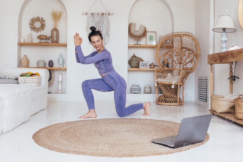 Женщина тренируется, смотрит онлайн-видео на ноутбуке, делает выпады, смотрит онлайн-тренировки на своем ноутбуке