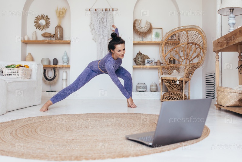 Молодая женщина практикует онлайн-уроки дома
