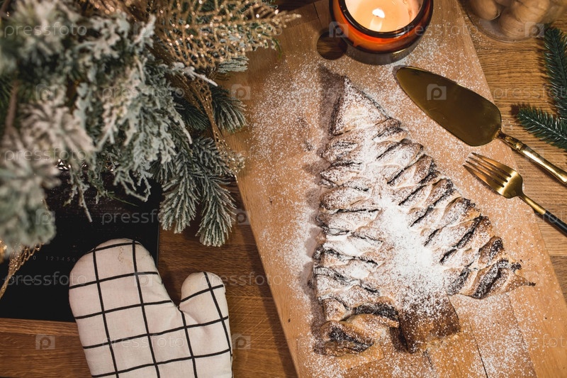 Мягкий фокус. Новогодний стол. Угощения для гостей. Торт из слоеного теста с шоколадом в виде елки на деревянном фоне. Концепция приготовления пищи на праздник