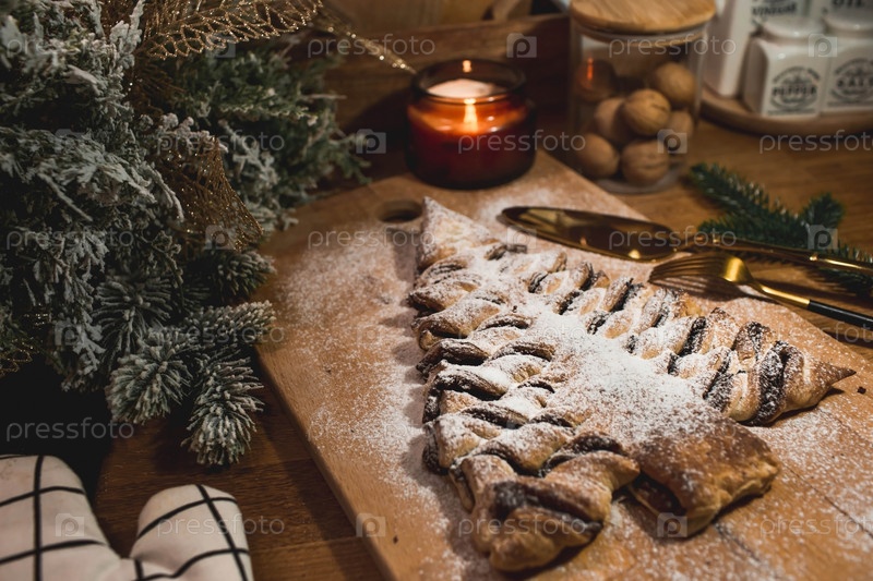 Мягкий фокус. Новогодний стол. Угощения для гостей. Торт из слоеного теста с шоколадом в виде елки на деревянном фоне. Концепция приготовления пищи на праздник