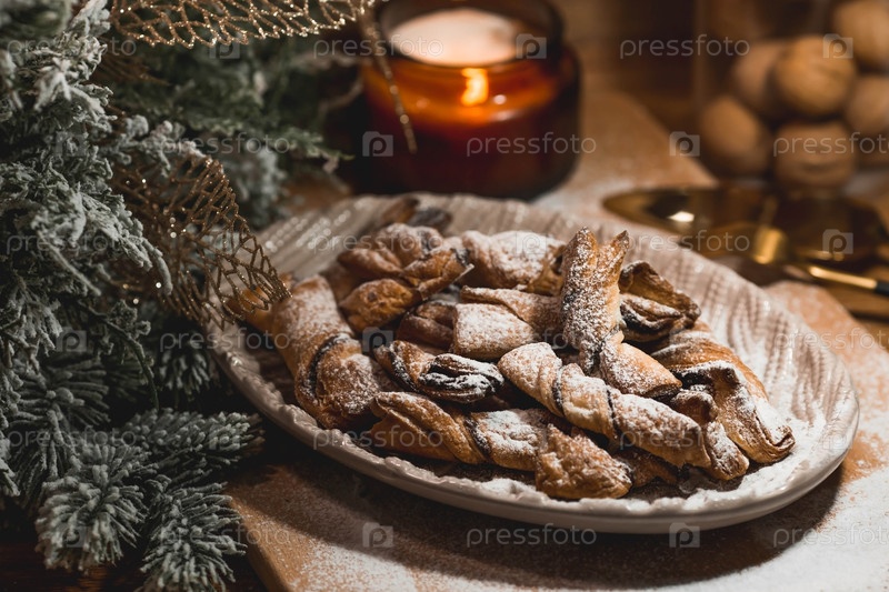 Мягкий фокус. Новогодний стол. Угощения для гостей. Торт из слоеного теста с шоколадом в виде елки на деревянном фоне. Концепция приготовления пищи на праздник