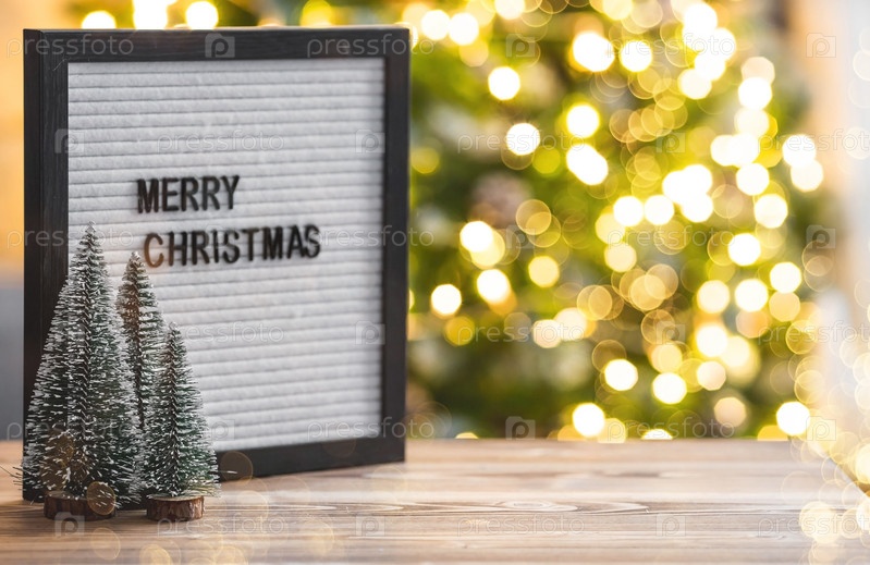 Табличка с надписью "Счастливого Рождества" на деревянном столе. Красивое боке на золотом фоне. Новогодний фон 2023 для демонстрации или инсталляции продукции и товаров