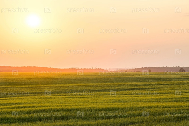Сельский пейзаж на закате. Красивая панорама уходящего солнца. Поле созревания ржи на переднем плане