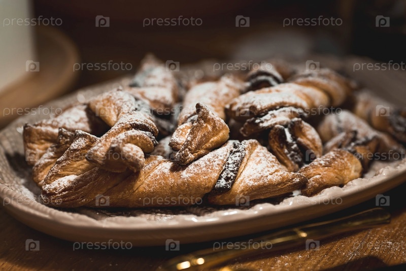 Мягкий фокус. Новогодний стол. Угощения для гостей. Торт из слоеного теста с шоколадом в виде елки на деревянном фоне. Концепция приготовления пищи на праздник