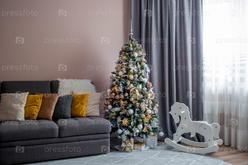 Уютный декор в серо-желтых тонах в интерьере новогодней комнаты, елка, украшенная гирляндами, подарки, деревянная лошадка. Праздничная гостиная в доме. Новогодние праздники 2022