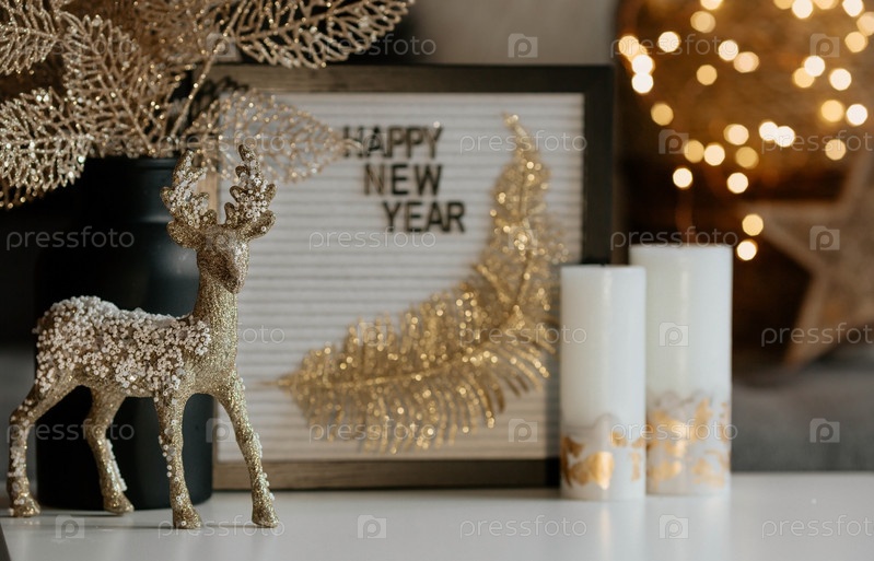 Табличка с надписью "С новым годом", олень, золотой букет, горящие свечи и письма домой на столе в домашнем интерьере гостиной. Уютная концепция праздника и зимы