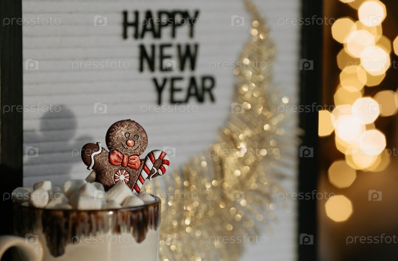 Табличка с надписью «С Новым годом», кружка с горячим какао, зефир и пряничный человечек на фоне красивого желтого боке. Уютная концепция Рождества и зимнего отдыха