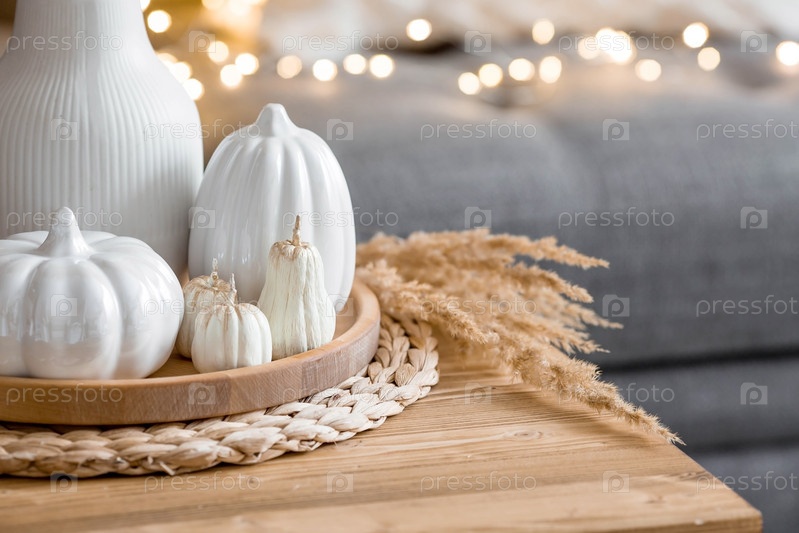 Натюрморт. Белые керамические тыквы, пампасная трава, свечи в форме тыквы на журнальном столике в домашнем интерьере гостиной. Детали декора. Уютная осенняя концепция