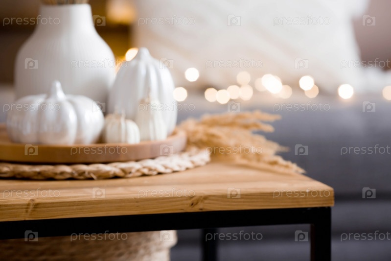 Размытый фон. Белые керамические тыквы, пампасная трава, свечи в форме тыквы на журнальном столике в домашнем интерьере гостиной. Детали декора. Уютная осенняя концепция