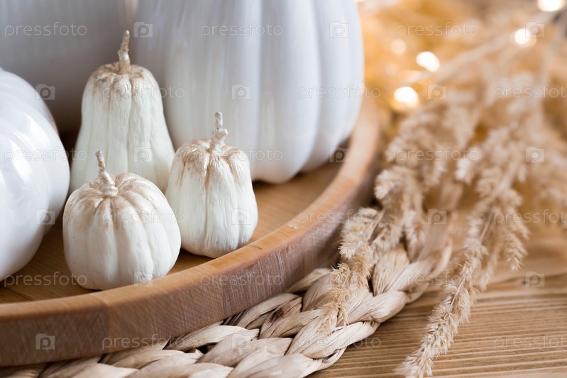 Натюрморт. Белые керамические тыквы, пампасная трава, свечи в форме тыквы на журнальном столике в домашнем интерьере гостиной. Детали декора. Уютная осенняя концепция