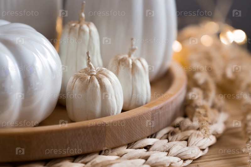 Натюрморт. Белые керамические тыквы, пампасная трава, свечи в форме тыквы на журнальном столике в домашнем интерьере гостиной. Детали декора. Уютная осенняя концепция