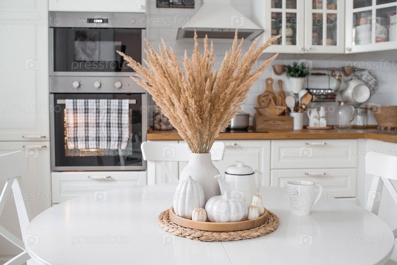 Натюрморт. Сушеная пампасная трава в вазе, белые керамические тыквы, чайник и свечи в форме тыквы на белом столе в интерьере домашней кухни в скандинавском стиле. Уютная осенняя концепция