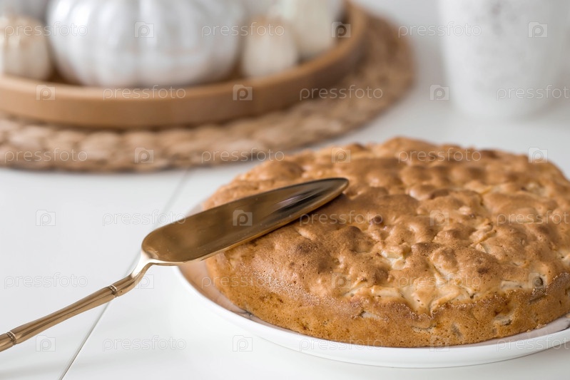 Натюрморт. Сушеная пампасная трава в вазе, белые керамические тыквы, свечи и шарлотка из яблочного пирога на белом столе в интерьере домашней кухни в скандинавском стиле. Уютная осенняя концепция