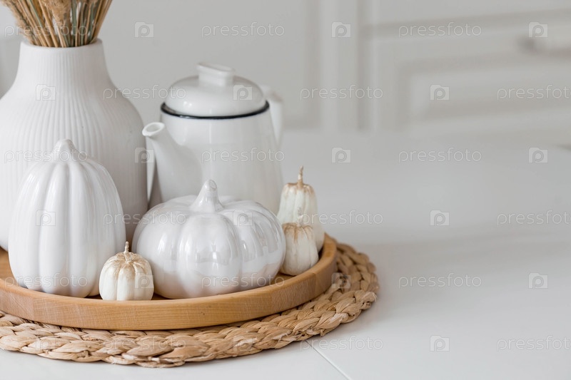 Натюрморт. Сушеная пампасная трава в вазе, белые керамические тыквы, чайник и свечи в форме тыквы на белом столе в интерьере домашней кухни в скандинавском стиле. Уютная осенняя концепция