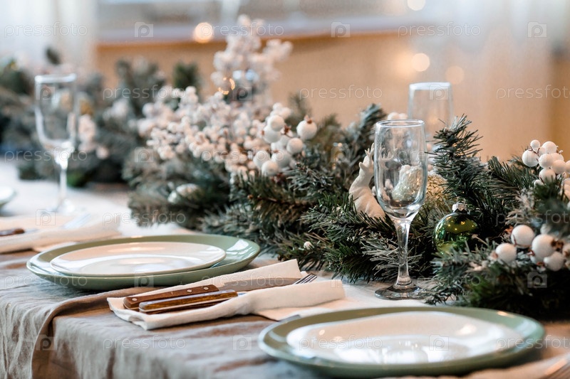 Красивый нарядно оформленный стол к новогоднему празднику. бокалы для шампанского, тарелки, еловые ветки, крупный план. Концепция бронирования кафе и ресторанов на праздники