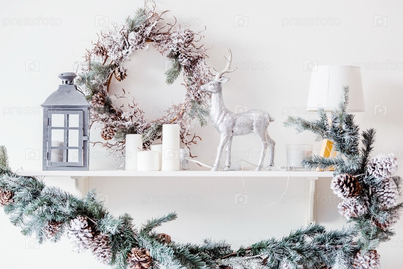 Новогоднее украшение на полке в белом интерьере с рождественскими гирляндами. Фонарик, олень, свечи и елка. Скандинавский стиль. Открытка к новому году