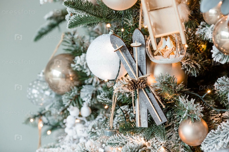 Баннер. Современный рождественский декор в красивых пастельных тонах. Деревянные игрушки и гирлянда на елку