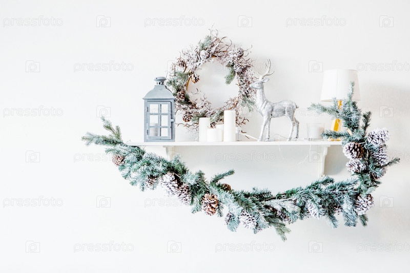 Новогоднее украшение на полке в белом интерьере с рождественскими гирляндами. Фонарик, олень, свечи и елка. Скандинавский стиль. Открытка к новому году