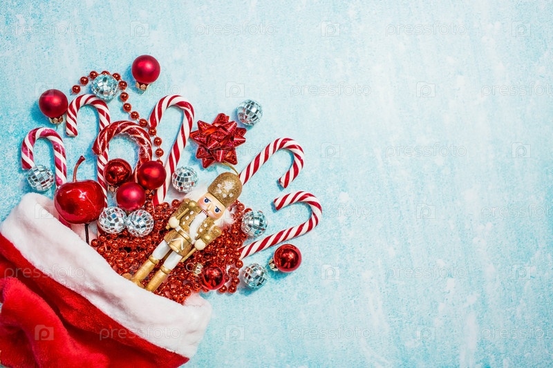 Рождественская шапка Санта-Клауса с рождественскими конфетами, игрушками и блестками на синем фоне. Минимальная рождественская концепция. Карамельная трость. Копия текстового пространства