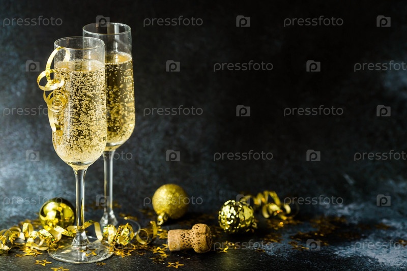С Новым 2021 годом. Рождественские и новогодние праздники фон с копией пространства. Два бокала и олень шампанского с блестящими огнями на темном фоне