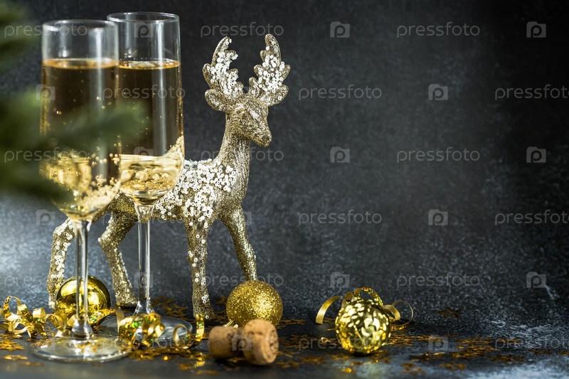 С Новым 2021 годом. Рождественские и новогодние праздники фон с копией пространства. Два бокала и олень шампанского с блестящими огнями на темном фоне