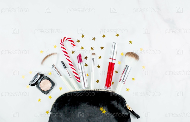 Баннер. Плоская композиция с декоративной косметикой и шляпой Санты на светлом фоне. Зимний уход. Понятие красоты и моды