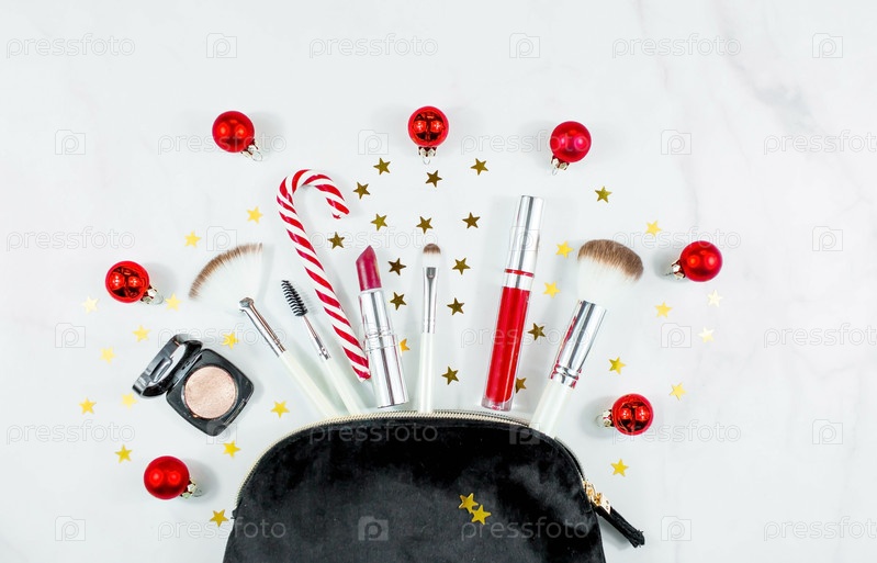 Плоская композиция с декоративной косметикой и сумкой на светлом фоне. Зимний уход. Понятие красоты и моды