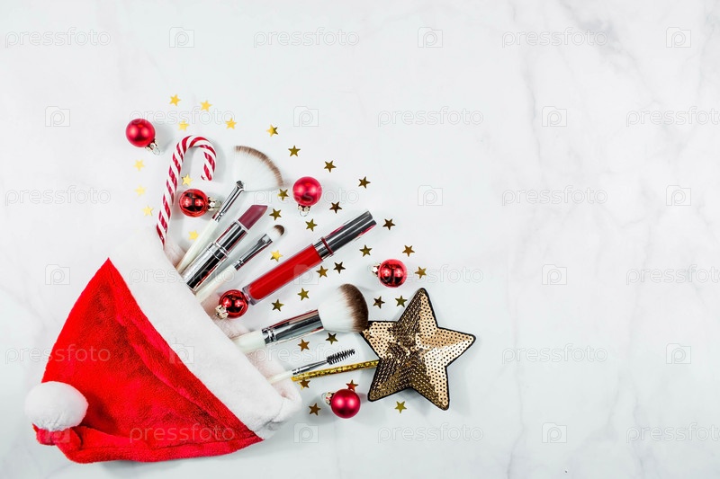 Баннер. Плоская композиция с декоративной косметикой и шляпой Санты на светлом фоне. Зимний уход. Понятие красоты и моды