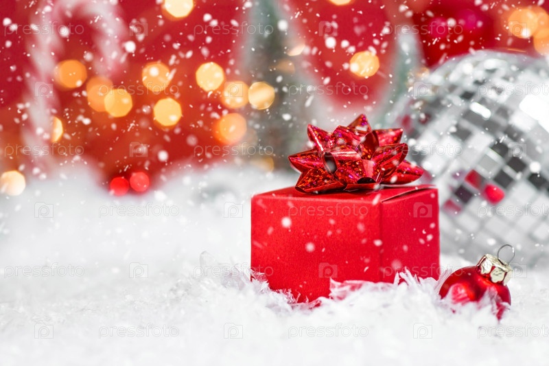 Баннер. Рождественская красная подарочная коробка в красном снежном пейзаже на фоне боке. Место для текста. Концепция доставки подарков и поздравительных открыток с Новым годом. Крупным планом