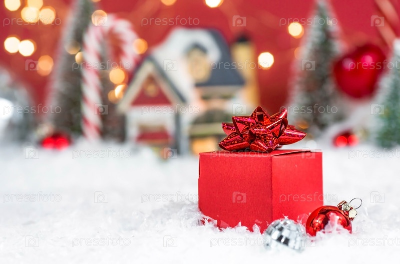 Баннер. Рождественская красная подарочная коробка в красном снежном пейзаже на фоне боке. Место для текста. Концепция доставки подарков и поздравительных открыток с Новым годом. Крупным планом
