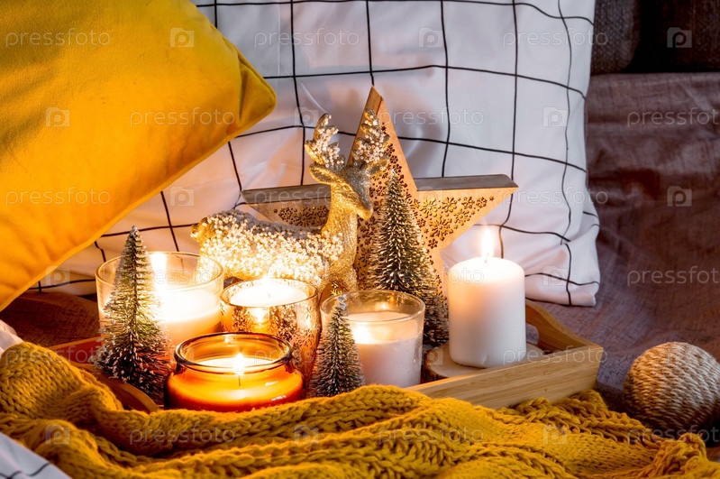 Зажженные свечи и рождественские украшения на деревянном подносе с теплым пледом. Зимний уютный стиль. Концепция хюгге