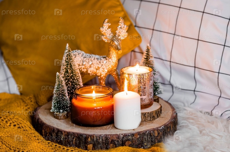 Зажженные свечи и рождественские украшения на деревянном подносе с теплым пледом. Зимний уютный стиль. Концепция хюгге