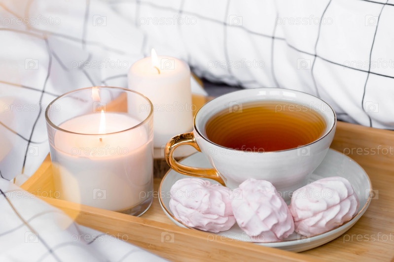 Деревянный поднос с чаем, зефиром и свечами на кровати. Белые простыни с полосатым одеялом и подушкой. Завтрак в постель