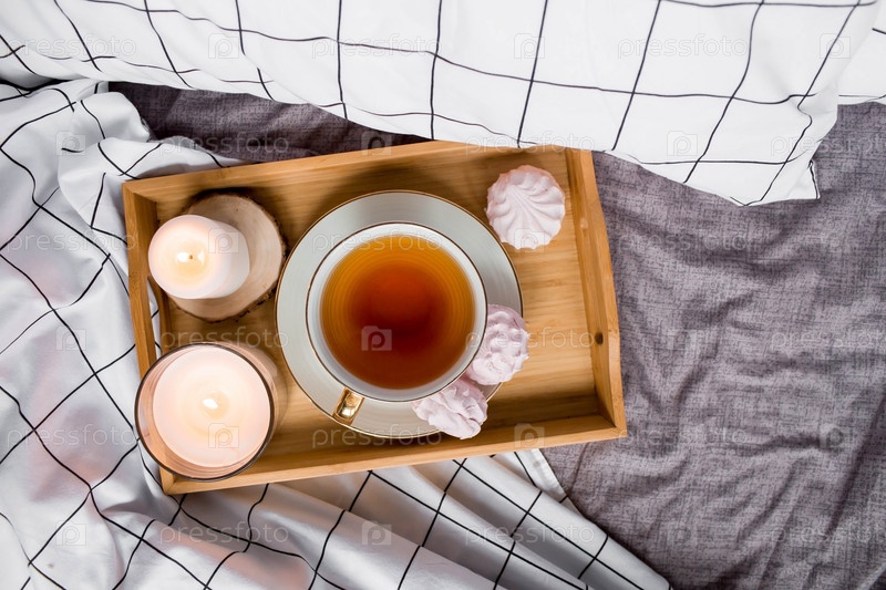 Деревянный поднос с чаем, зефиром и свечами на кровати. Белые простыни с полосатым одеялом и подушкой. Завтрак в постель