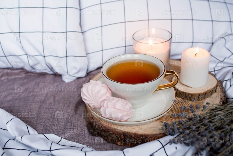 Деревянный поднос с чаем, зефиром, свечами и лавандой на кровати. Белые простыни с полосатым одеялом и подушкой. Завтрак в постель