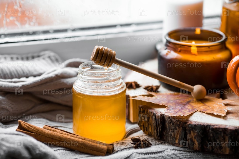 Осенний натюрморт с красивым боке. Чашка горячего чая, чайник, мед, свечи и вязаный плед на подоконнике. За окном осенние листья и капли дождя