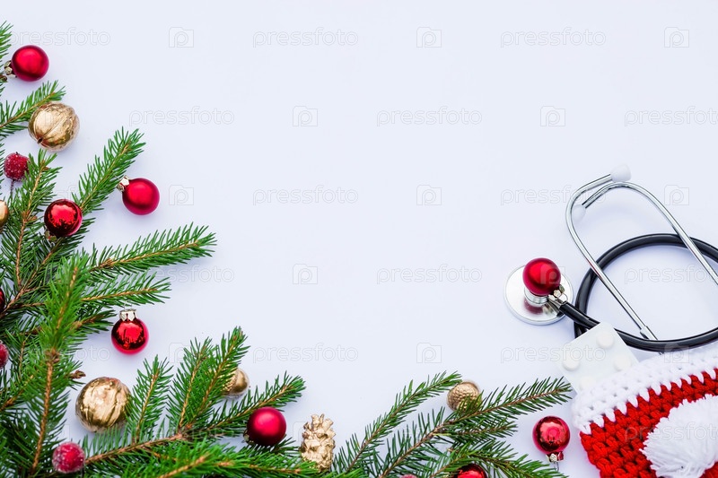Медицинский баннер 2023 года для клиник с таблетками, стетоскопом и рождественской елкой на белом фоне. Копипространство. Медицина новый год плоский