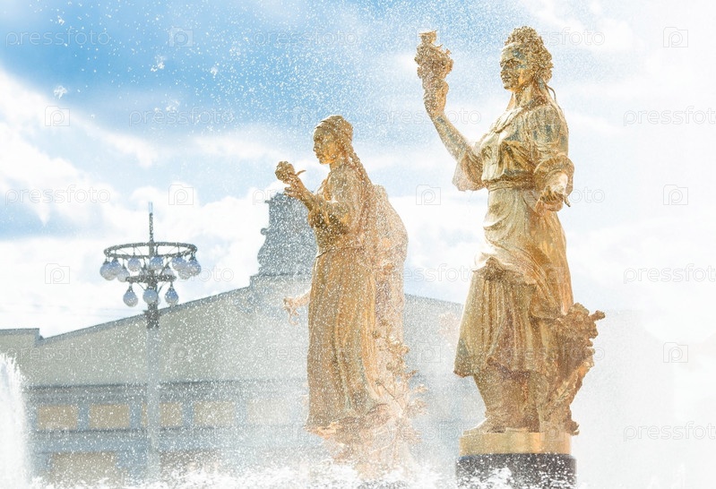 МОСКВА, РОССИЯ. Фонтан Дружба народов СССР или Дружба народов СССР в солнечный летний день на фоне голубого неба, парк ВДНХ