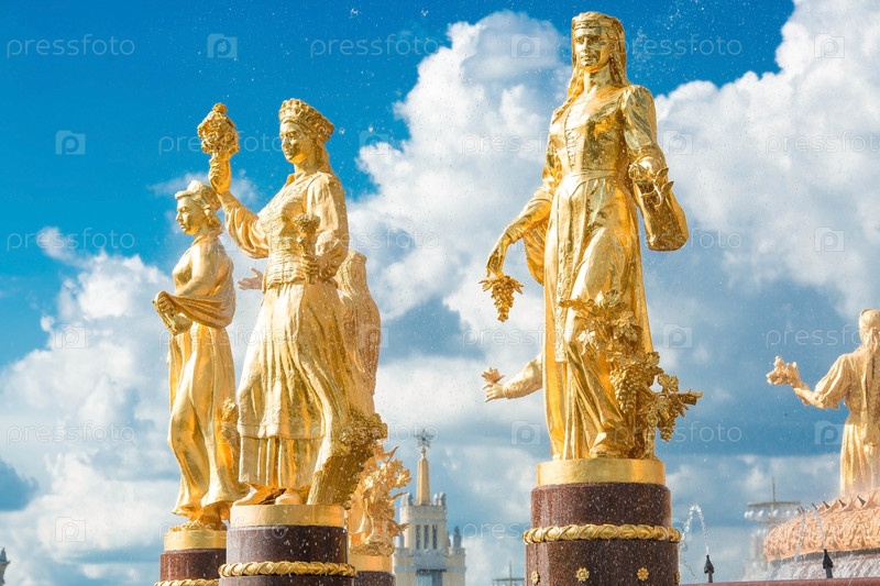 МОСКВА, РОССИЯ. Фонтан Дружба народов СССР или Дружба народов СССР в солнечный летний день на фоне голубого неба, парк ВДНХ