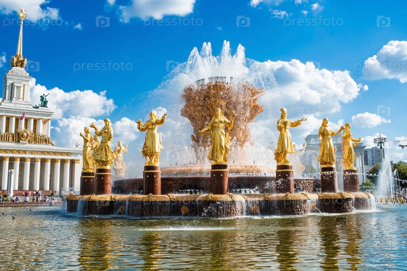МОСКВА, РОССИЯ. Фонтан Дружба народов СССР или Дружба народов СССР в солнечный летний день на фоне голубого неба, парк ВДНХ