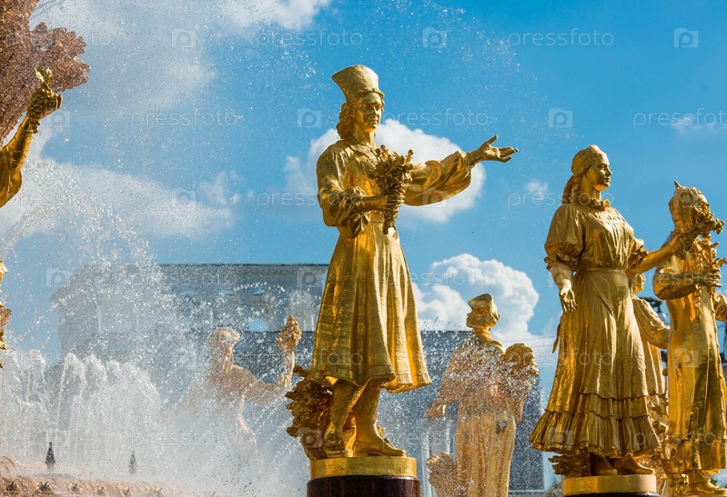 МОСКВА, РОССИЯ. Фонтан Дружба народов СССР или Дружба народов СССР в солнечный летний день на фоне голубого неба, парк ВДНХ