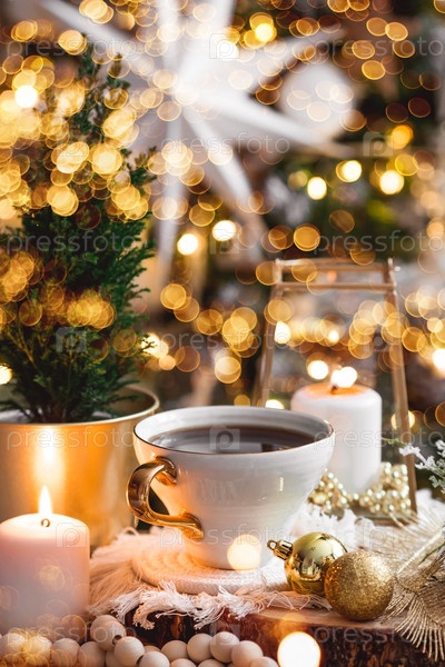 Образ жизни. Чашка чая, елка, свечи и золотые шары на деревянном столе на фоне красивого боке во время рождественских праздников. Натюрморт. Концепция домашнего тепла, уюта