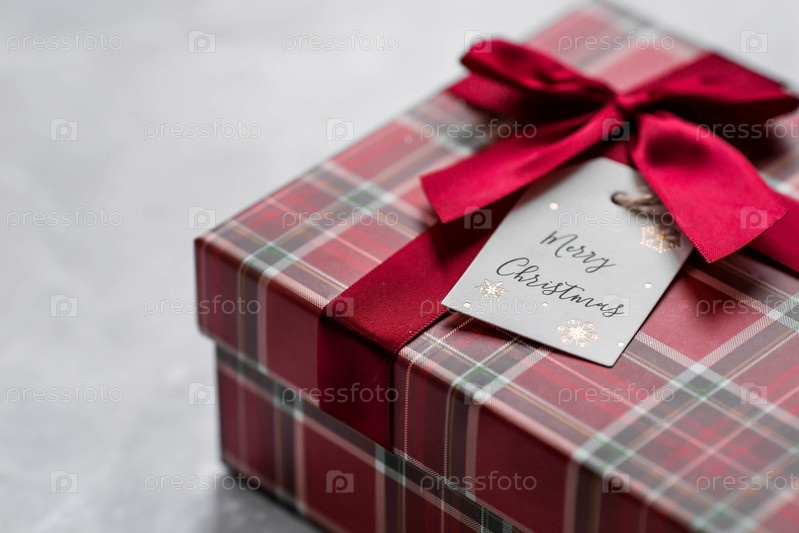 Красная подарочная коробка в клетке и этикетка с надписью "Счастливого Рождества" на фоне серого мрамора. Рождественские праздники 2023. Покупка и подготовка подарков для родных и близких