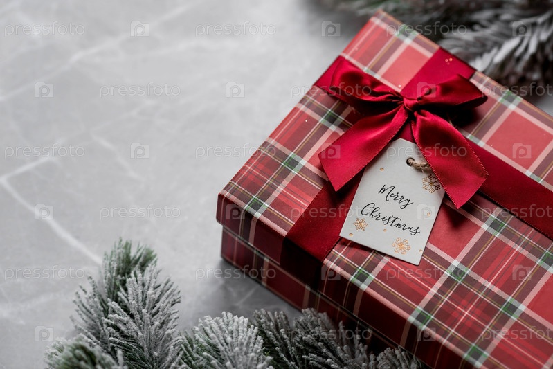 Красная подарочная коробка, еловые ветки, леденец и этикетка с надписью "Счастливого Рождества" на фоне серого мрамора. Рождественские праздники 2023. Покупка и подготовка подарков для родных и близких