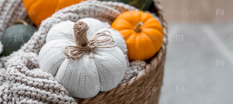 Натюрморт. Вязаная тыква, оранжевые тыквы, бежевый вязаный плед в самодельной плетеной корзине. Уютная осенняя концепция. Домашний декор