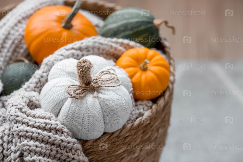 Натюрморт. Вязаная тыква, оранжевые тыквы, бежевый вязаный плед в самодельной плетеной корзине. Уютная осенняя концепция. Домашний декор