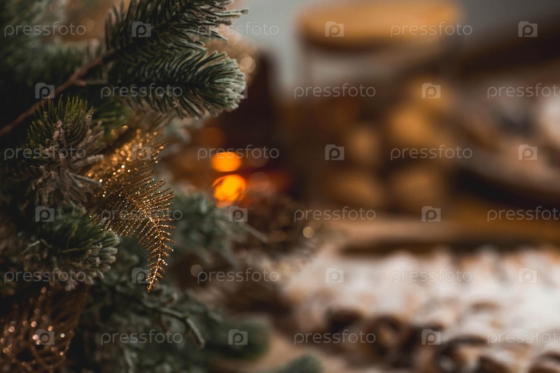Мягкий фокус. Новогодний стол. Угощения для гостей. Торт из слоеного теста с шоколадом в виде елки на деревянном фоне. Концепция приготовления пищи на праздник
