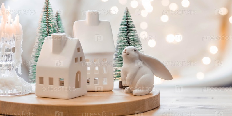 Рождественские елки, белый кролик и скандинавские белые домики на деревянном столе в уютной гостиной. Стильная новогодняя открытка в скандинавском стиле