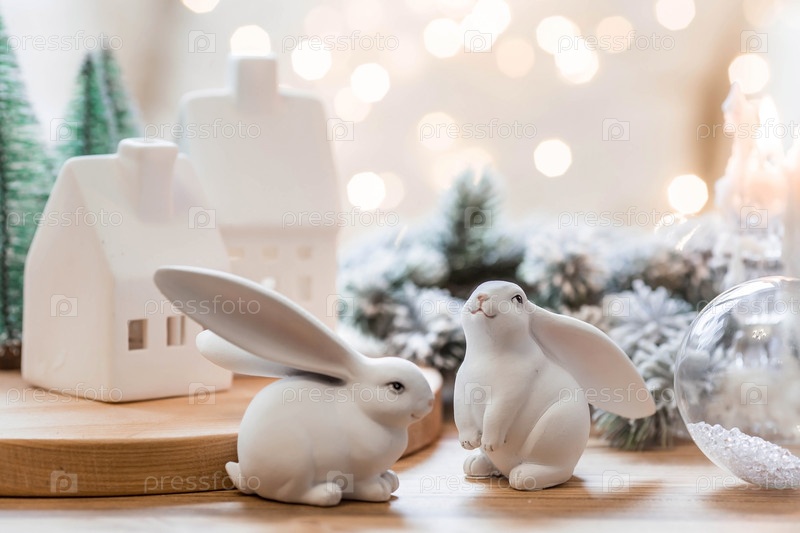 Рождественские елки, белый кролик и скандинавские белые домики на деревянном столе в уютной гостиной. Стильная новогодняя открытка в скандинавском стиле