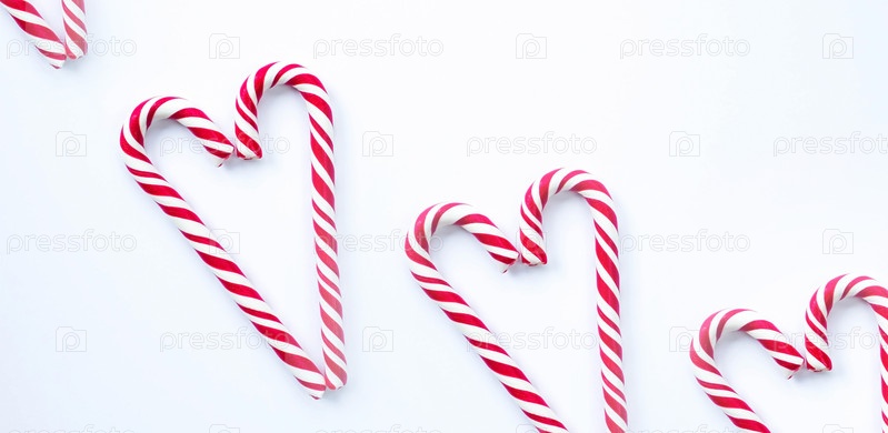 Баннер. Две полосатые леденцы в форме сердца, белый фон. концепция любви, минимализм, плоская планировка, место для копирования текста